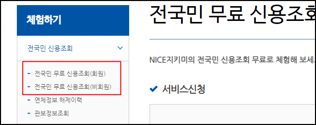 2.왼쪽의 전국민무료신용조회 회원 / 전국민무료신용조회 비회원 중에 원하는 항목을 클릭해서 조회를 하시면 됩니다.